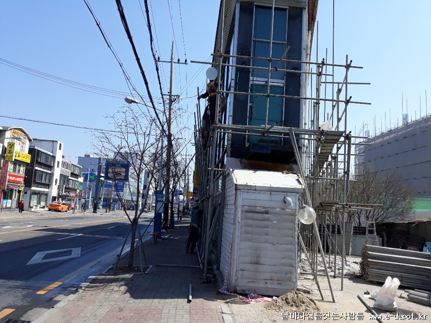 외부공사를 위해서 비계설치작업을 합니다. 기존 건축물이 인도에 접해있어서 보행자들의 편의와 안전을 우선으로 하여 비계를 설치하도록 합니다.
