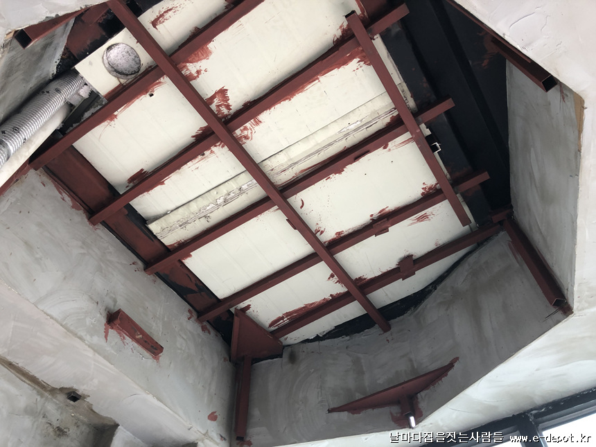 조립식 건물이 노후화 되어 판넬이 일부 파손되고 변형되어 내,외부로 구석 구석 누수의 흔적이 보입니다.