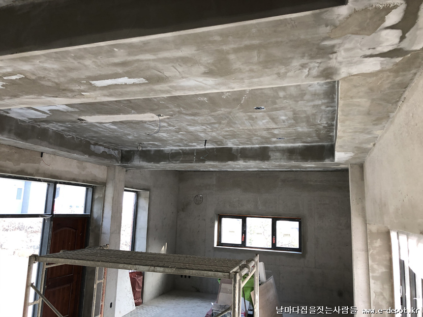 노출 콘크리트 마감벽체의 창호 주변은 단열재로 각을 잡아 메쉬작업으로 매끄럽게 한 후 노출 콘크리트 분위기를 만들어 마무리 합니다.