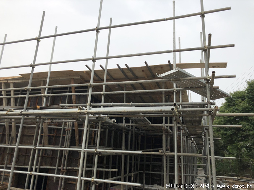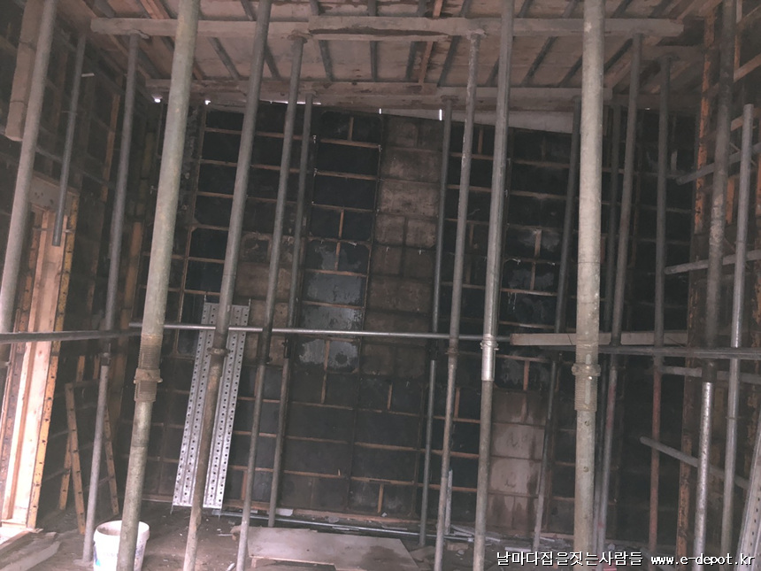 지붕 스라브 처가마 넓은 거푸집을 동바리(서포트)로 받칠 경우 지면에서 부터 시작하여 상부까지 일체감있게 받쳐주도록 합니다. 간혹 외부비계를 이용하여 비계에다 동바리를 받치는 경우가 있는데 이는 절대 해서는 안되는 위험한 방법입니다. 2층 이상의 높이를 작업하다보면 일을 쉽게 하기 위해서 이런 방법을 사용하는 작업자들이 간혹 있는데 외부비계는 작업자들이 작업을 하기 위한 발판역할을 하는것이기 때문에 일정무게를 버틸수는 있지만 콘크리트와 같이 무게감있는 중량을 버티기는 어렵습니다. 특히 콘크리트 타설시 압력이 배가 되어 콘크리트 타설시 붕괴의 위험이 발생할 수 있으니 동바리를 외부비계에 받치는 방법은 절대 사용하지 말고 안전한 다른 방법을 강구하도록 해야겠습니다. 주택은 일반 상업건물처럼 높지 않으니 가능한 바닥 지면에서부터 동바리를 세워주도록 합니다. 높이가 높을 경우 동바리간 후리도메를 하여 유동이 생기지 않도록 철저히 보강하면 되겠습니다. 콘크리트 타설시 붕괴의 원인은 동바리를 제대로 받쳐주질 못한경우가 많으니 동바리는 바닥면이 단단하고 고른곳에 수직으로 반듯하게 세워 받치도록 해야 합니다.