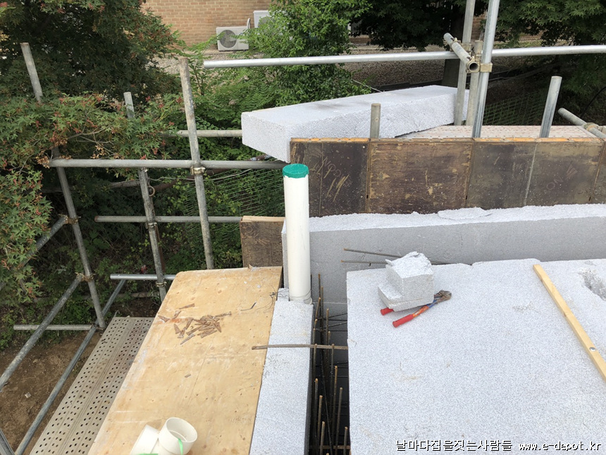 층별 스라브의 경우는 해당이 없지만 지붕과 같이 최상층 스라브의 경우 외부와 직접 접하는 부위로 단열재를 시공하여야 합니다. 단열재는 스라브 상부에 붙일수도 있고 스라브 하부에 붙일수도 있는데 상부에 붙이는 경우는 골조가 마무리 된 후 후시공하면 되지만 스라브하부에 붙이는 경우는 골조작업시 시공을 해야 합니다. 물론 후시공이 안되는것은 아니지만 작업의 편의성이나 단열재와 스라브골조와의 기밀한 접착을 위해서 콘크리트골조작업시 선시공하는것이 유리합니다. 스라브거푸집 마무리 작업과 단열재깔기, 동바리, 후리도메, 우수드레인설치과정을 공사사진과 함께 알아보겠습니다.