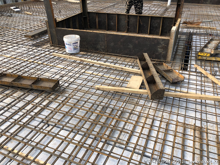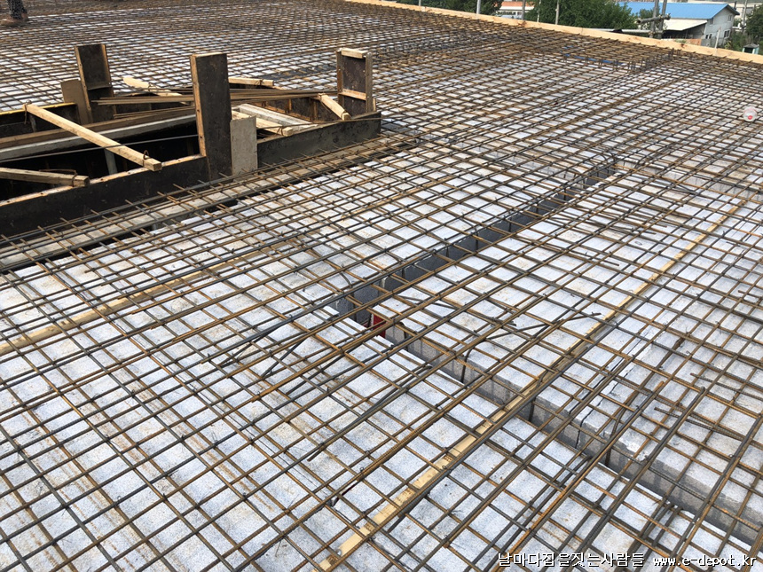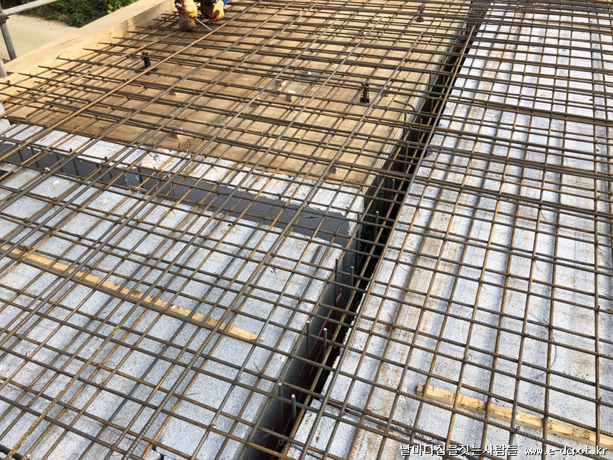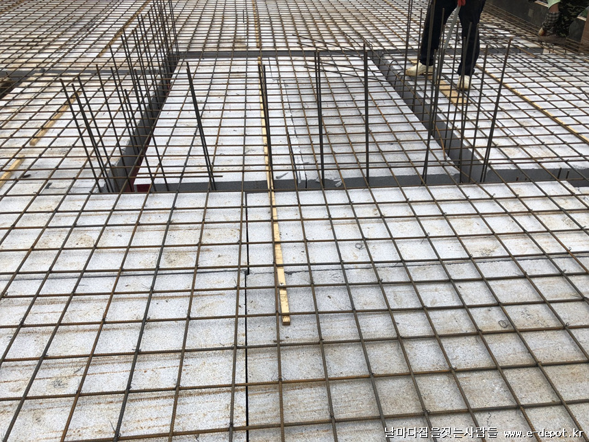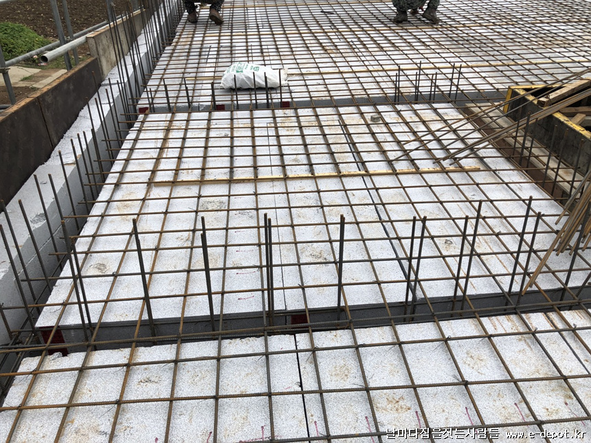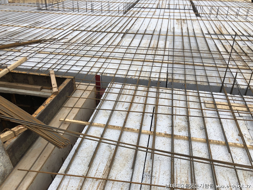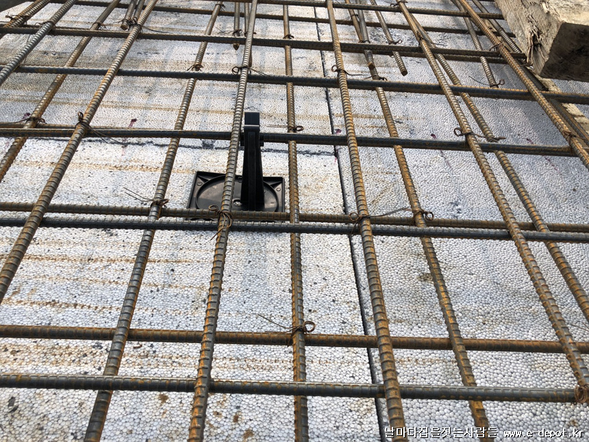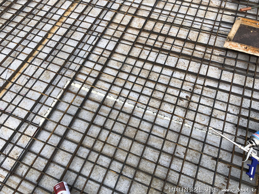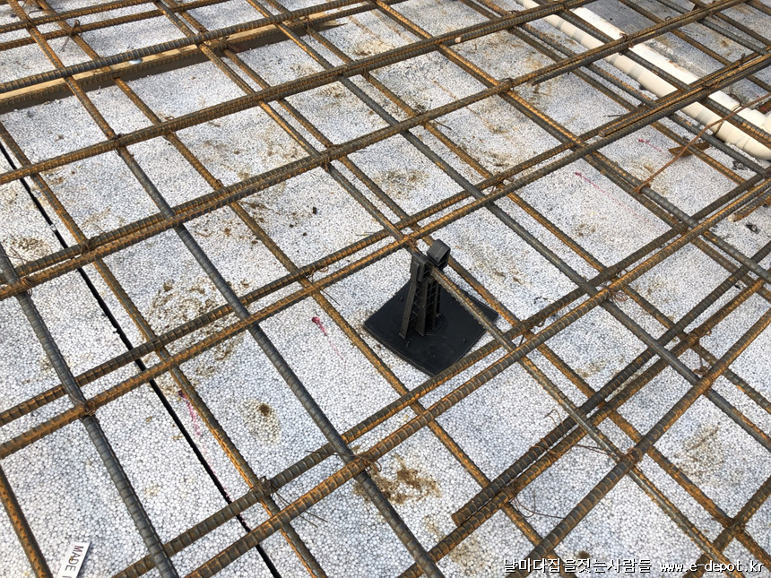 스라브 상부 철근 받침 사진입니다. 단열재부위에 스페이셔 판을 깔고 스페이셔를 받쳐 줍니다. 스페이셔 판이 없을 경우 합판을 켜서 대체하여 깔고 받쳐줘도 됩니다.