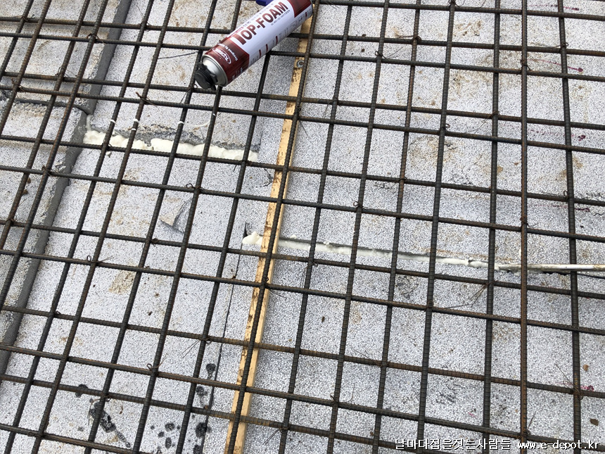 스라브 단열재 이격공간에 우레탄 폼 충진 사진입니다.