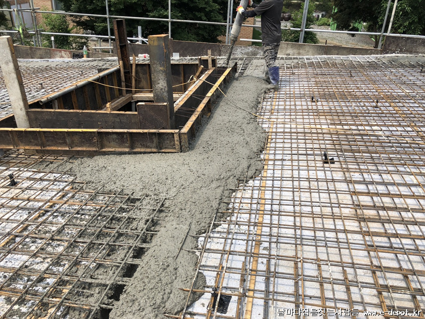 콘크리트 타설하면서 바이브레더작업을 병행하여 레미콘 배합이 잘 되도록 합니다.