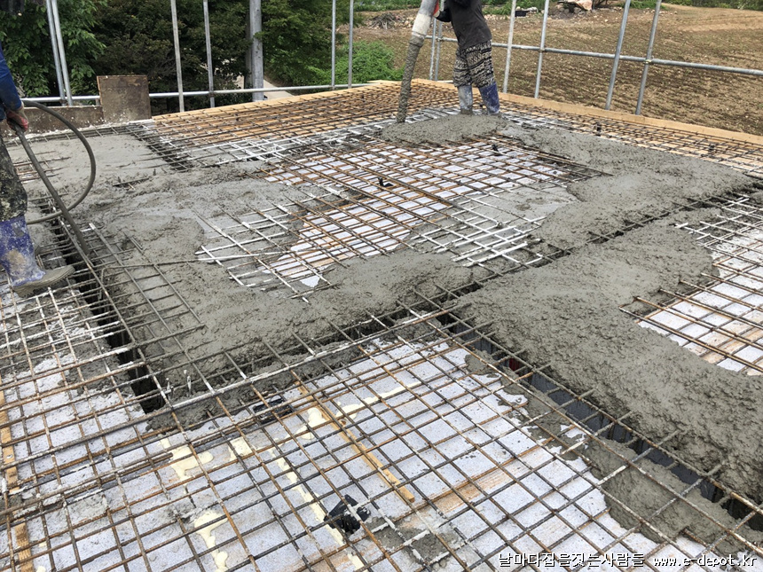 날마다집을짓는사람들의 전원주택 집짓기.지붕스라브거푸집시공 및 철근배근 후 콘크리트타설과정이었습니다.
