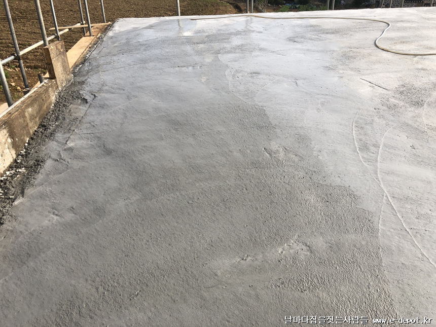전원주택시공과정 : 지붕콘크리트타설 후 적정한 습윤상태를 유지하기위한 살수작업 및 옹벽거푸집해체