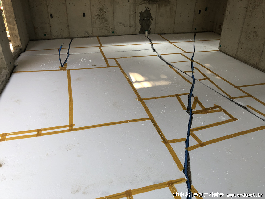 충격방지소음재/바닥단열재시공/단열기포타설 -> 난방코일깔기 -> 바닥몰탈타설