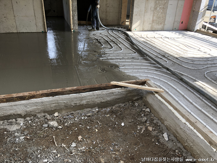 바닥몰탈 타설 중입니다. 바닥몰탈의 경우 평균40~50cm 두께를 유지해주는것이 좋습니다.