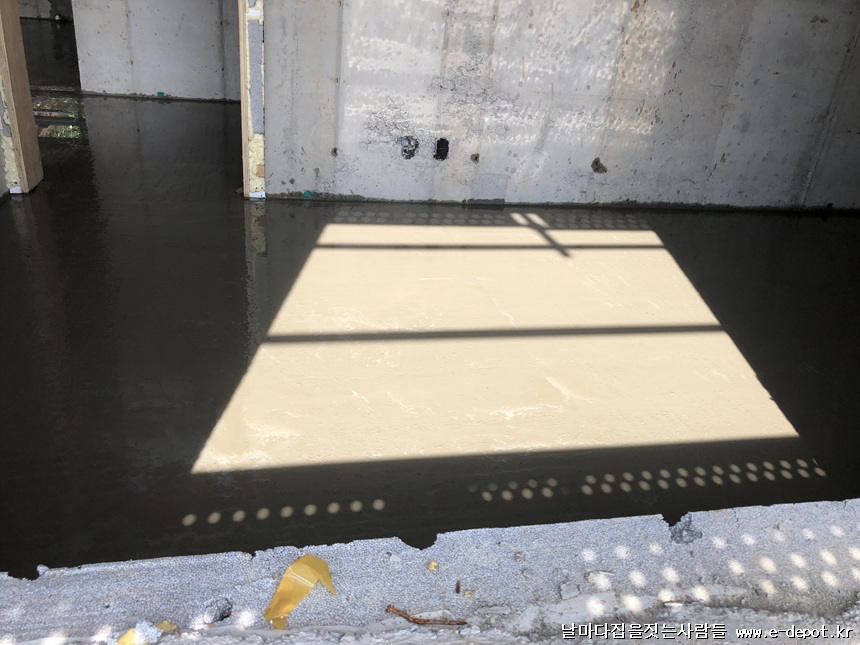 이전에 바닥에 단열재를 깐후 단열기포타설을 작업하여 2일정도 양생을 하였습니다.