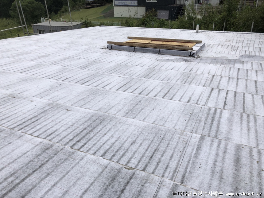 지붕 합판취부위에 방수시트를 시공한 사진입니다. 방수시트 시공은 징크작업전에 1차 방수의 역할도 있지만 징크의 결로방지에도 도움이 됩니다. 징크가 철판이다보니 기온차로 결로 발생이 되기도 합니다.
