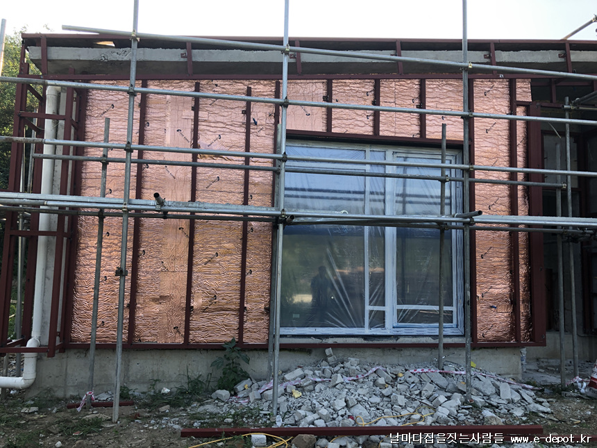 내부 외벽에 단열재시공한 부위 외부벽에도 열반사단열재를 보강 시공한 사진입니다.