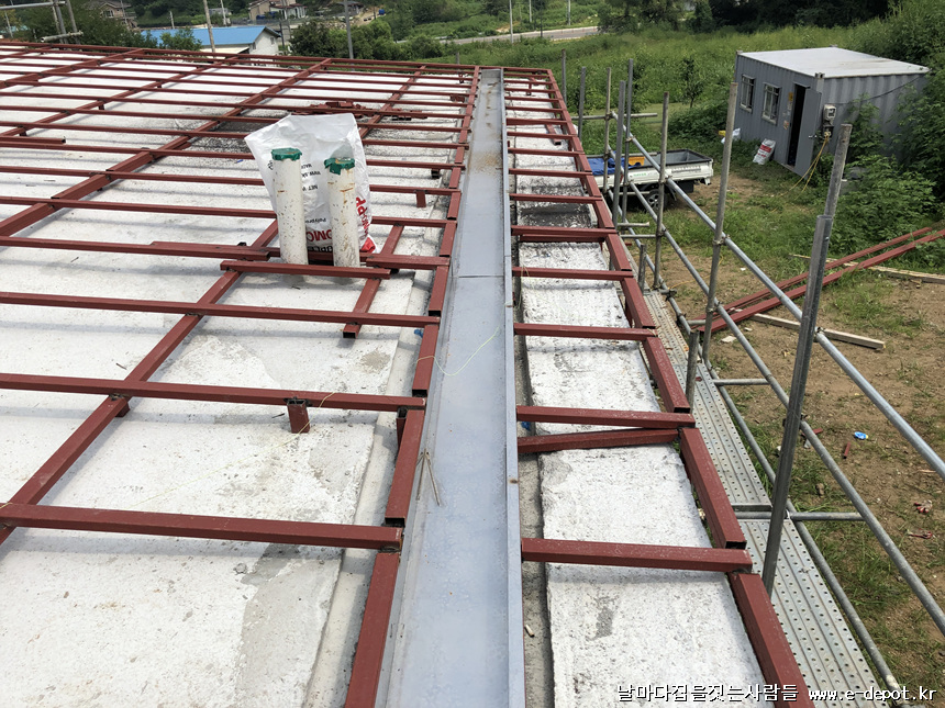 지붕의 물받이 노출없이 우수거터로 대치하여 우수거터를 징크작업전에 매립하도록 합니다.