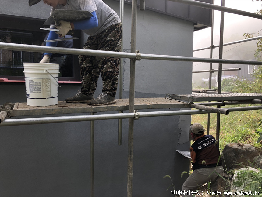스타코플렉스 2차 도포사진입니다. 1차 도포작업에서 미비한 부분을 보강하면서 깔끔하게 최종 마무리 합니다.