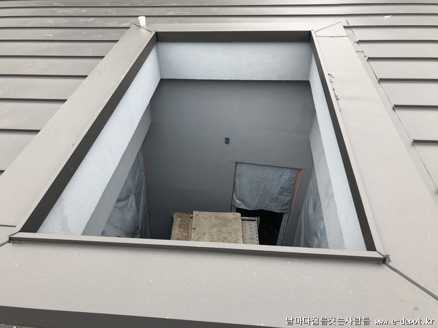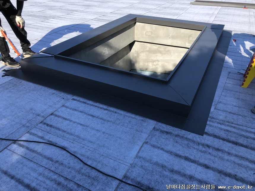 지붕 천창 주변 물방지턱 후레싱 및 징크 작업 사진입니다.