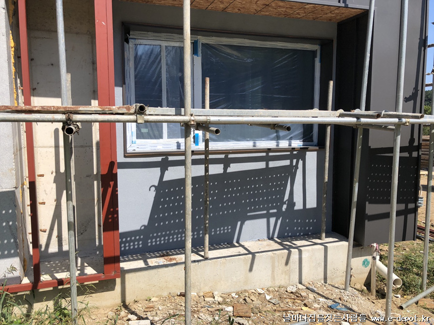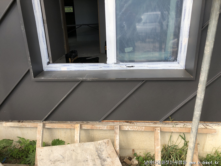 창문주변 후레싱을 포함하여 징크작업이 마무리 된 후 스타코 플렉스 마감을 한 상태입니다.