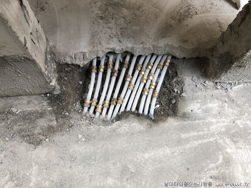 보일러실에서 내실로 연결되는 난방코일 12가닥이 모두 손상되어 보수하기위해 주변정리를 한 상태입니다. 난방코일 밑에 있는 수도관까지 완전히 작살이 났네요...;