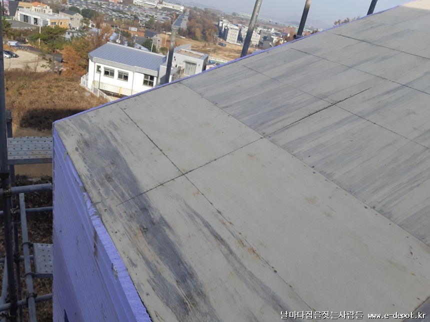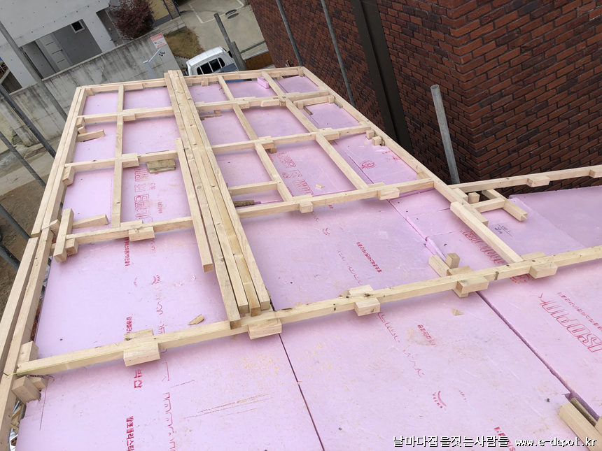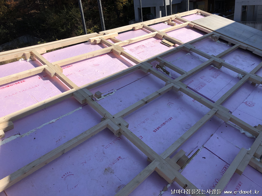 지붕 단열재 위에 목재틀이 완성 된 사진입니다.