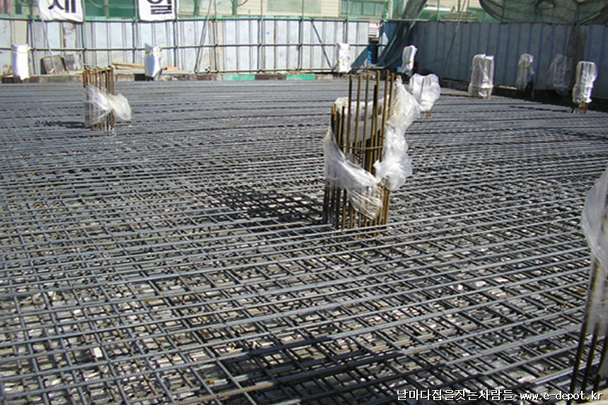 주차장 바닥에 철근배근을 완료한 사진입니다