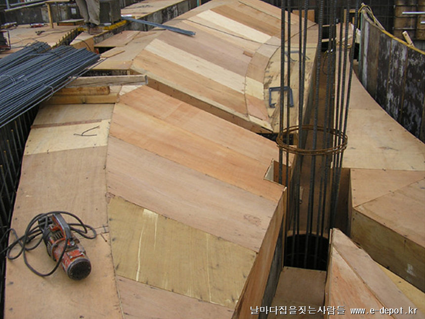 원형 형태의 경사면 스라브 거푸집 조성 사진입니다.