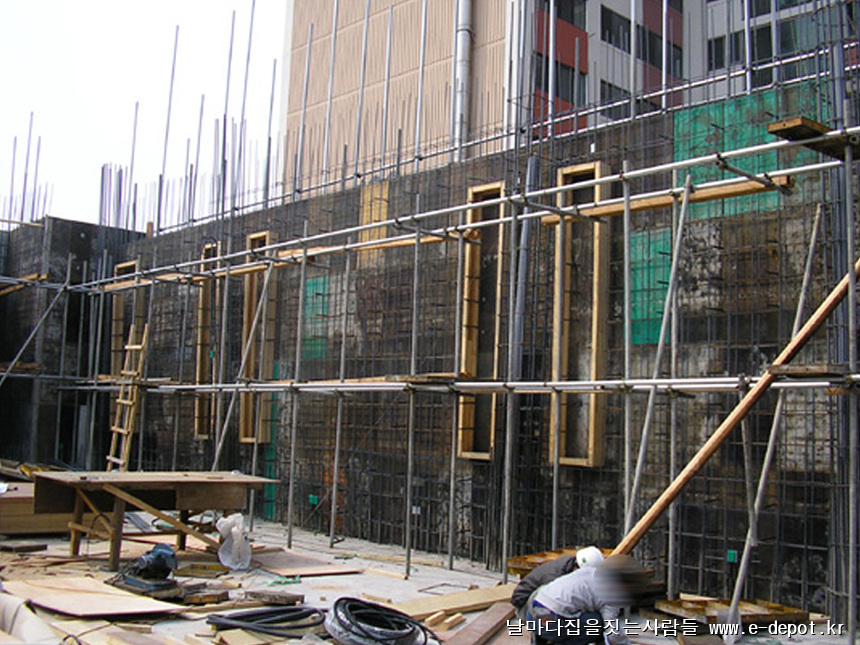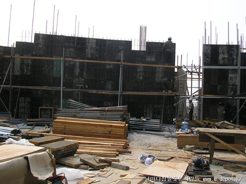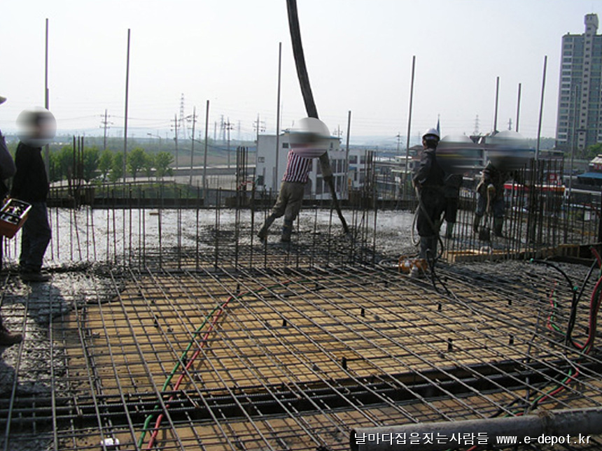 단층 건물의 경우 옹벽과 지붕스라브 거푸집 완성 후 한번 콘크리트 타설로 골조공사가 마무리 되지만 2층 이상의 건물일 경우 1층 옹벽과 스라브 거푸집 조성과 콘크리트 타설 후 층수에 따라 반복적으로 작업이 진행됩니다.