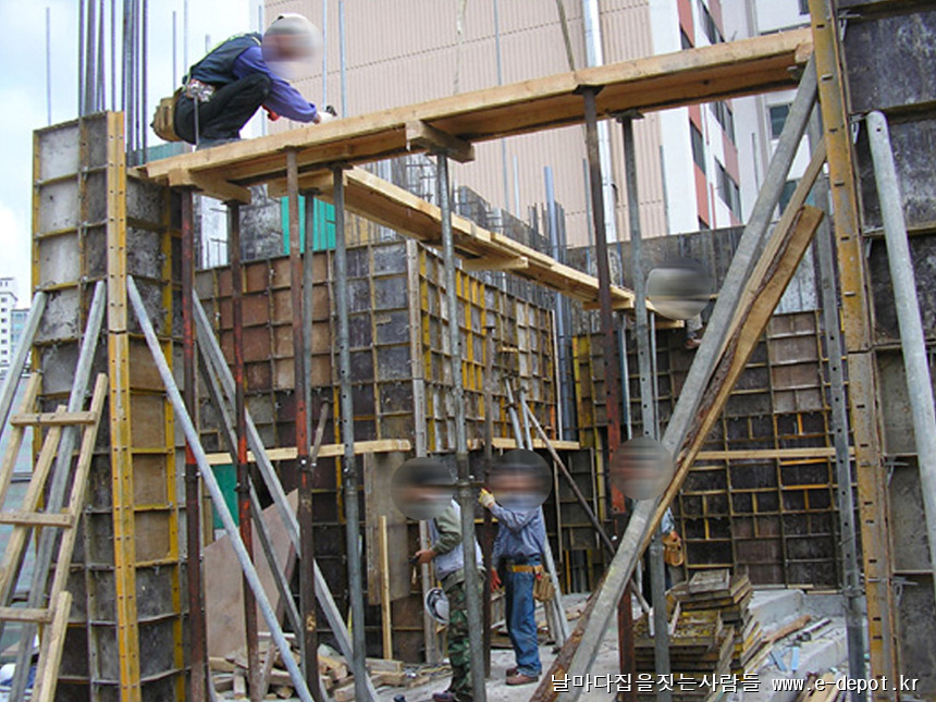 지난 시간에 이어서 이번 시간에도 연속적인 옹벽에 야기리를 인양하여 거푸집을 조성한 후 층고가 높은 스라브에 2중 동바리를 세워 스라브 거푸집을 완성하는 과정을 살펴보겠습니다. 층고가 높은 경우 주로 시스템 동바리를 사용하지만 같은 원리로 2중 동바리를 조성하여 작업을 하기도 합니다. 이때 반드시 수평연결대를 견고히 설치 연결하도록 합니다. 현장 용어로는 '후리도메'라고 하는데 동바리가 따로 놀지 않도록 시스템동바리 처럼 일체감있게 작업을 해야 합니다.