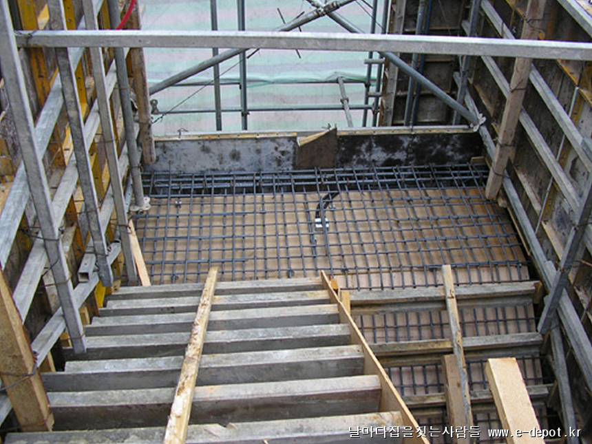 계단실 철근 배근 후 계단판 조성 사진입니다.