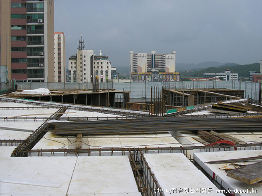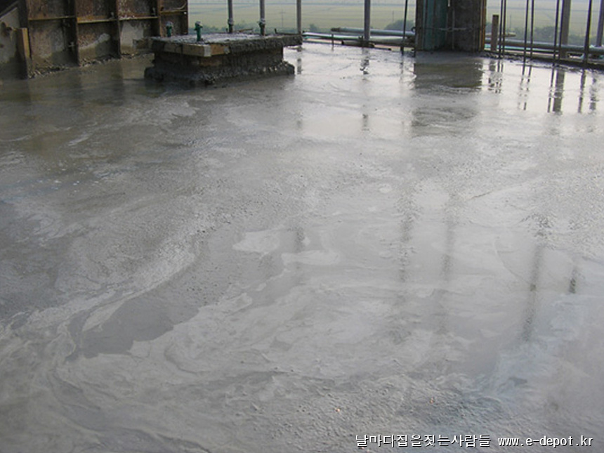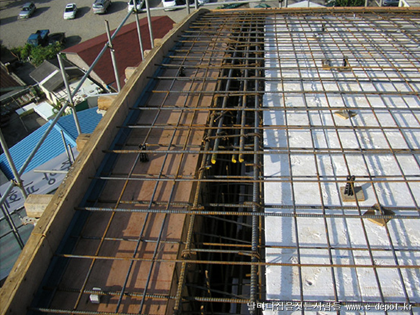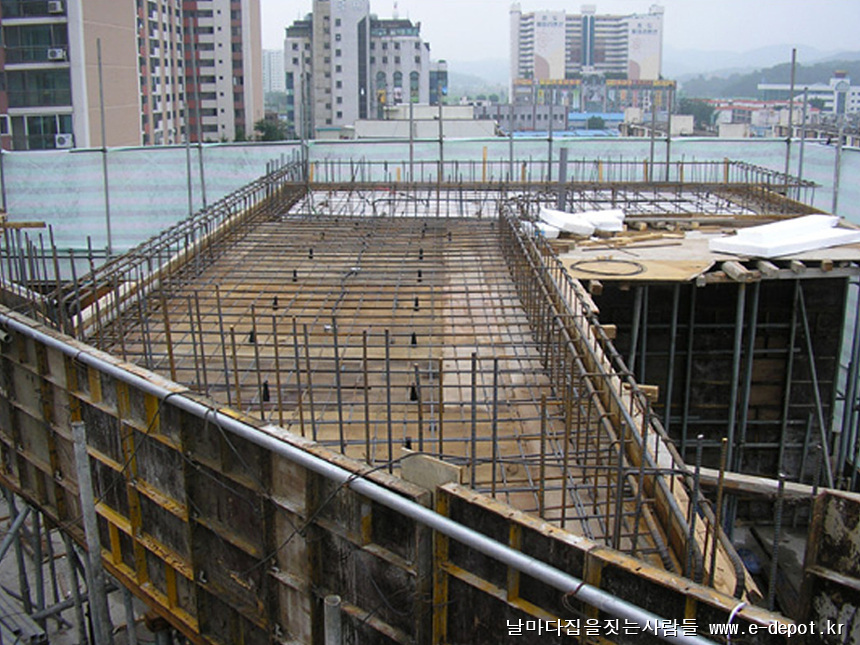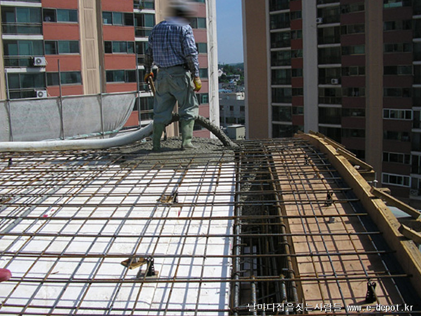 최상층의 콘크리트 타설시 미장공을 투입시켜 쇠흙손 마감으로 콘크리트면을 깔끔하게 처리해 주도록 합니다.