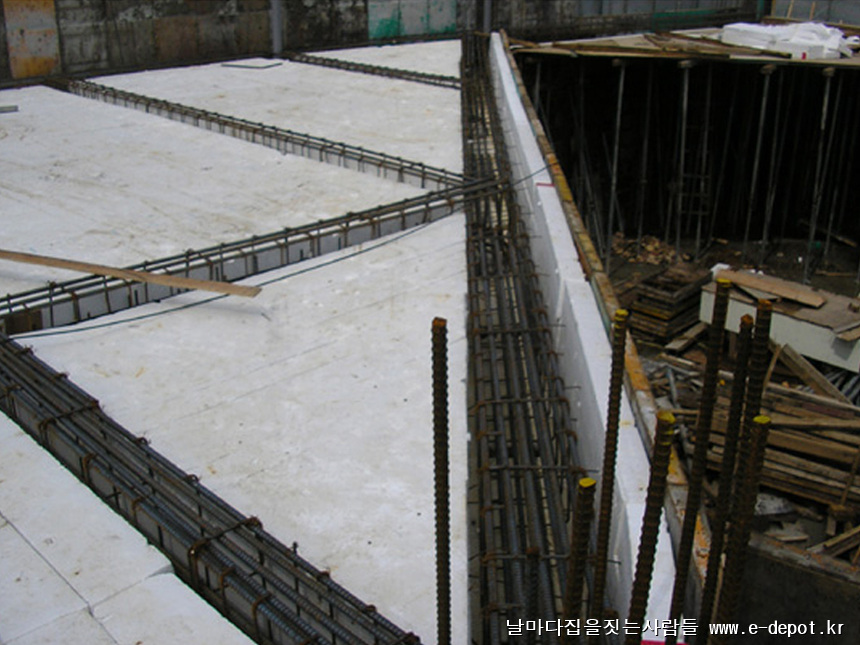 최상층 스라브의 경우 합판거푸집 위에 단열재를 깔아줍니다.