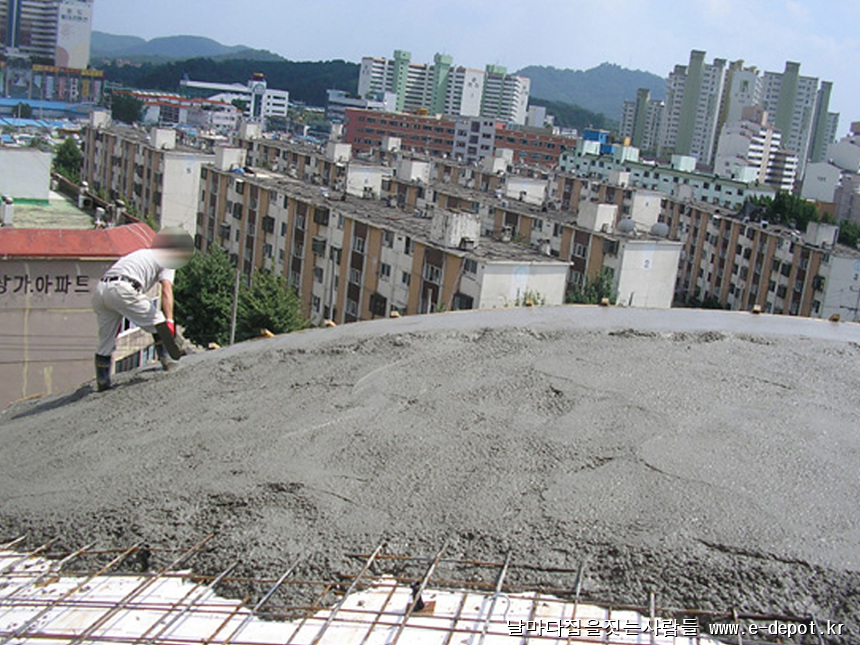 최상층의 콘크리트 타설시 미장공을 투입시켜 쇠흙손 마감으로 콘크리트면을 깔끔하게 처리해 주도록 합니다.
