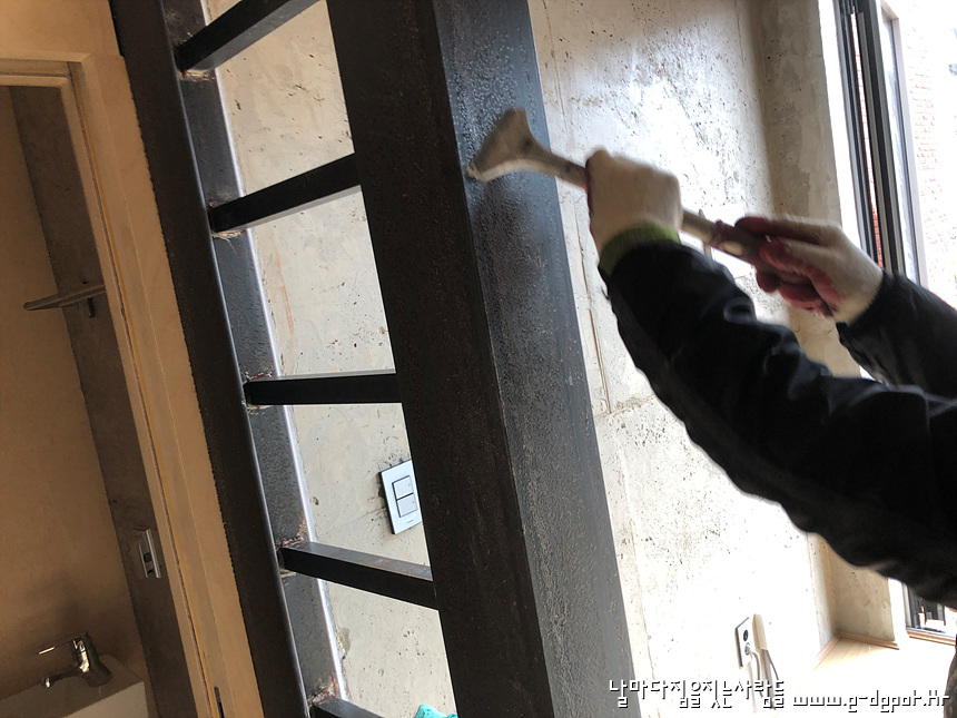 철 구조물을 노출상태로 코팅하기 전 스크래퍼를 이용하여 노출면을 손질합니다.