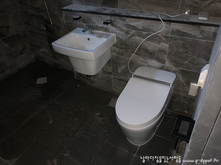 거실 공용화장실의 양변기,세면기등 도기 설치 사진입니다.