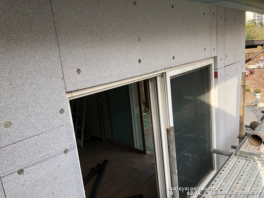 창호 보강 작업이 끝나면 외부비계를 설치하고 단열재 붙이는 작업에 착수합니다.