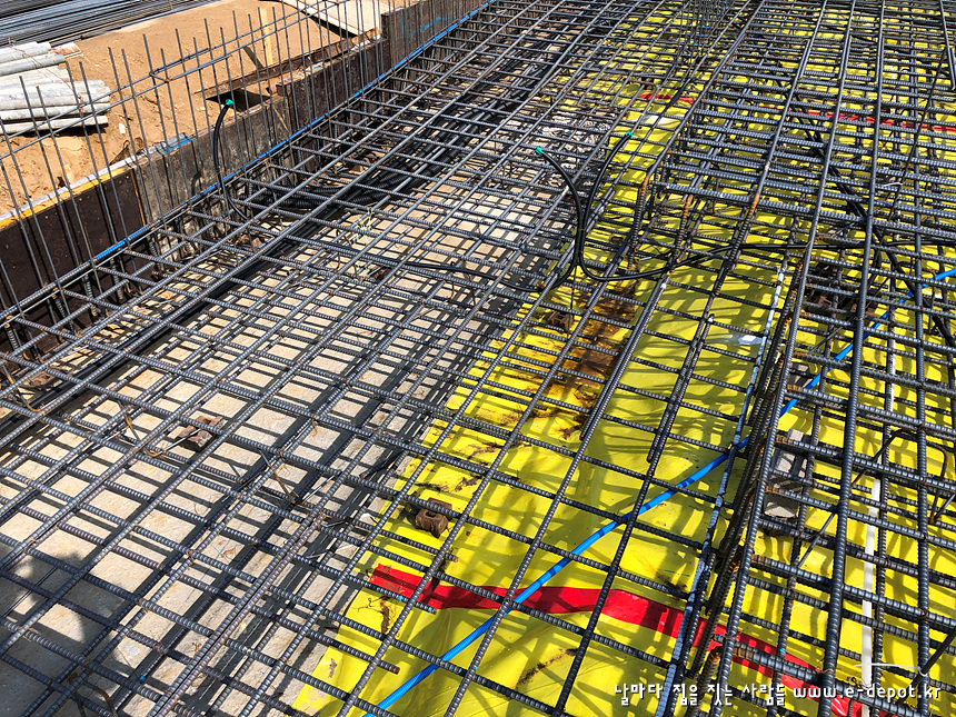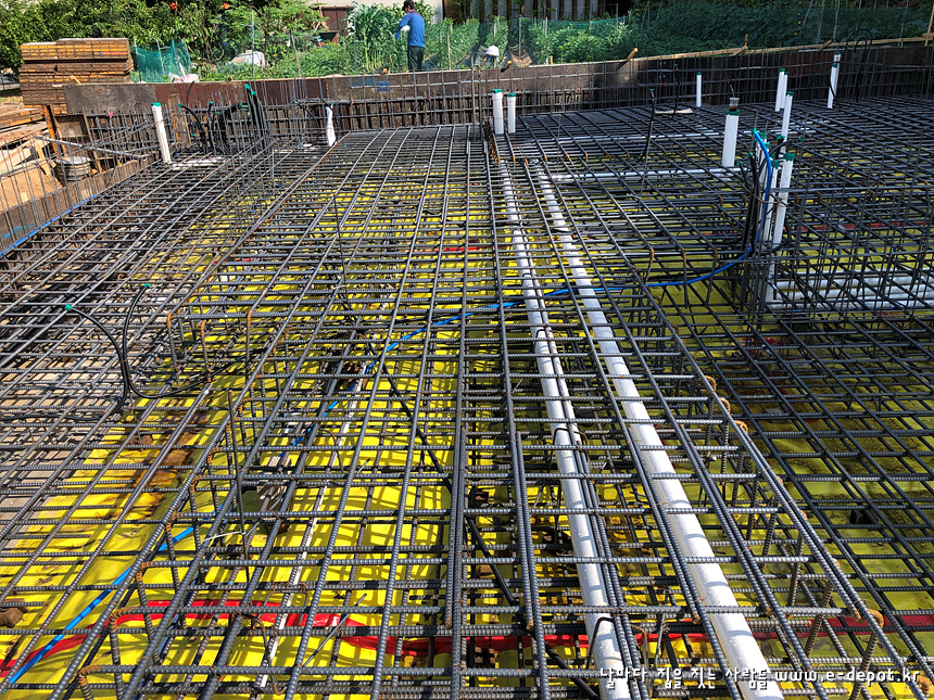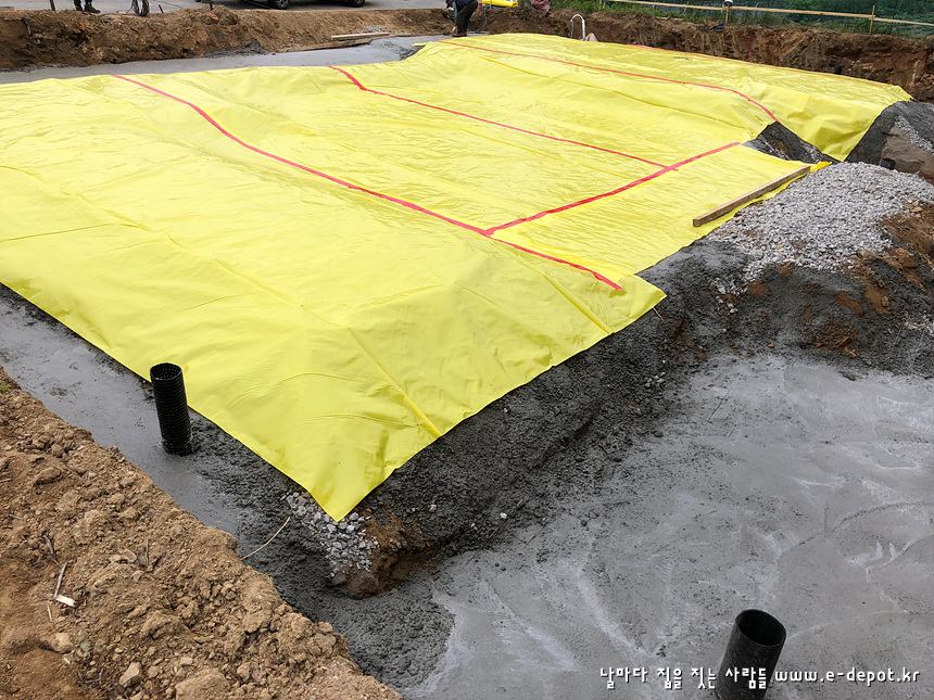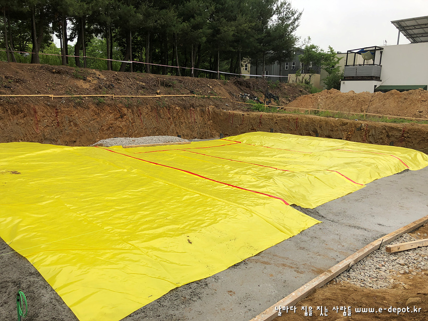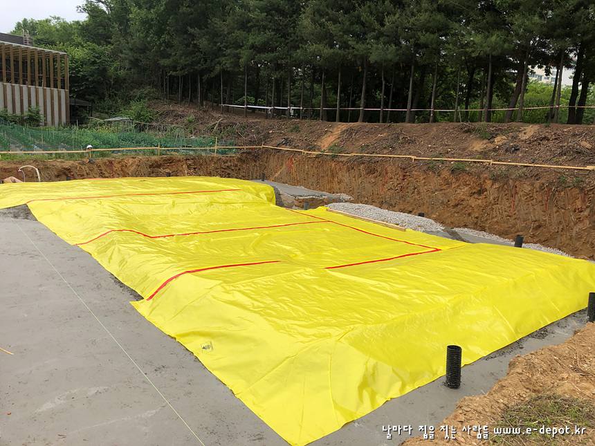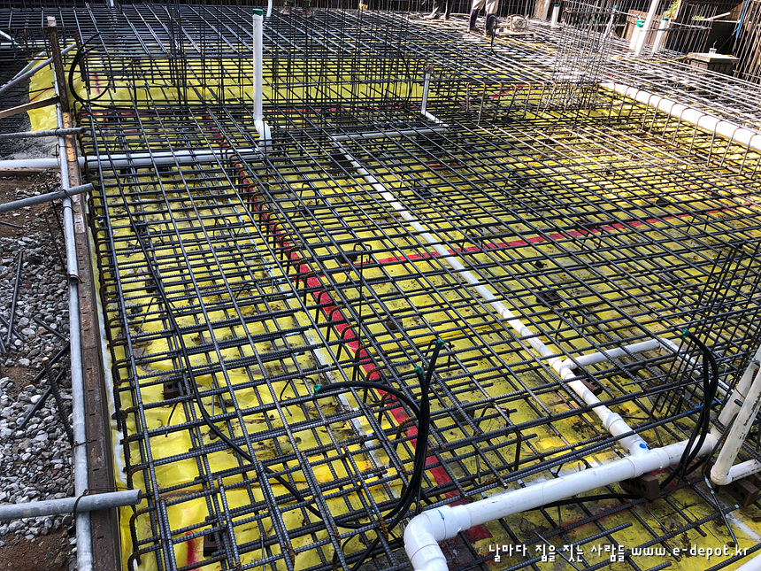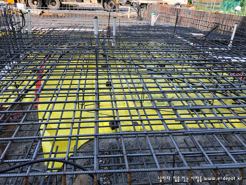 파주시 패시브주택 시공사례. 방사능 라돈차단필름 스테고랩깔고 기초철근배근 후 콘크리트타설
