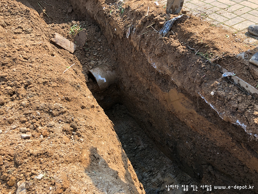 상수도 인입부위가 정확히 표기되어 있지 않아서 도로면 대지경계를 따라 전체적으로 터파기를 하던 중 시 우수관로가 나왔네요. 상수도, 우수관, 오수관, 전기, 통신등 대지내 인입부위의 표식이 제대로 설치 되어 있지 않을 경우 인입시 에로사항이 많답니다. 관계기관에서는 택지조성 후 분양할때는 민원인들을 위한 철저한 조치가 필요하다고 생각합니다.