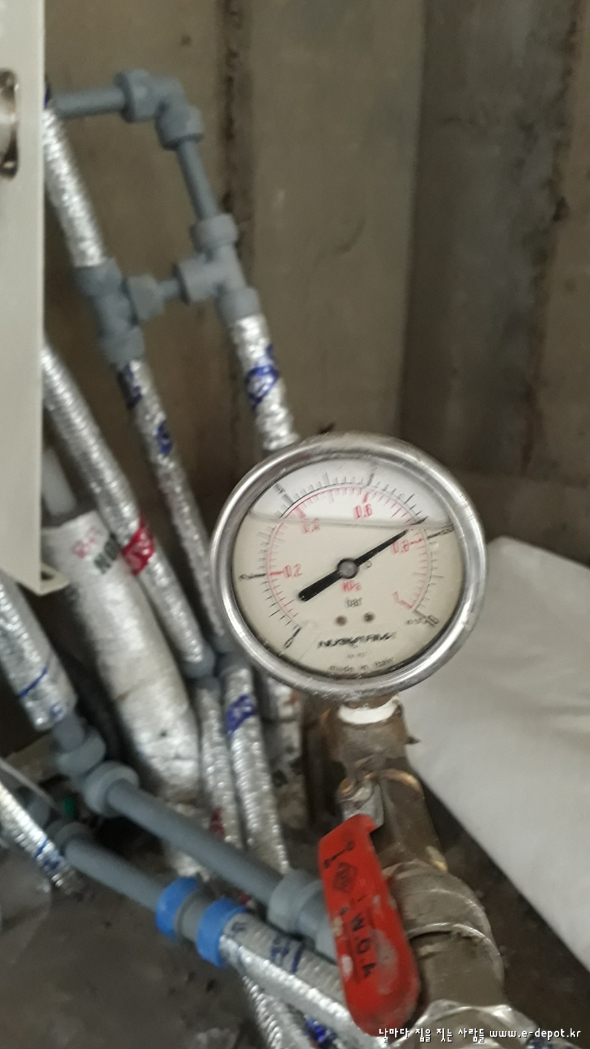 급수관은 직접 수도를 연결하여 수압을 체크하는 방법과 에어를 주입시켜 공기압을 체크하는 방법이 있으며 위의 사진은 에어를 주입시켜 공기압으로 체크한 사진입니다