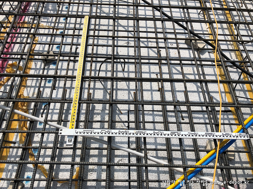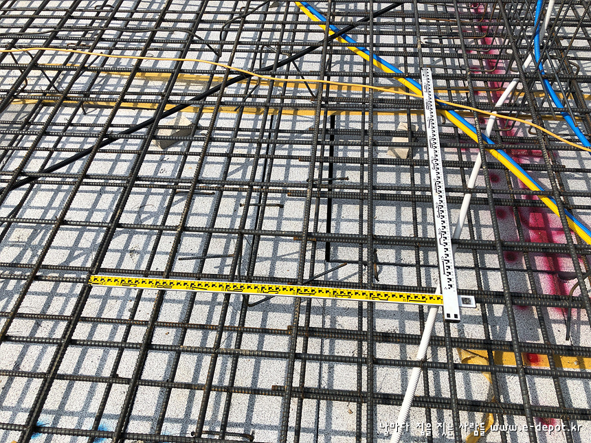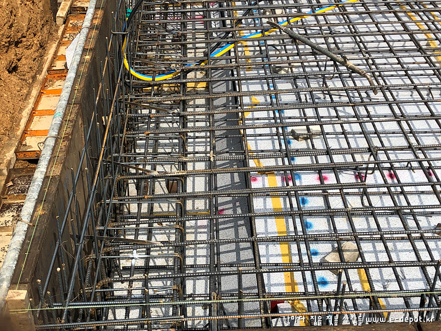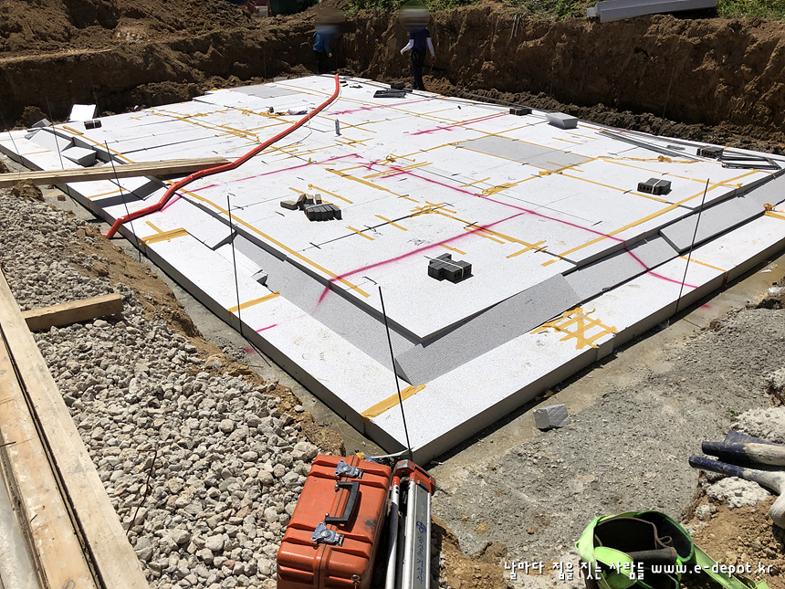 버림 콘크리트 타설 후 1일정도 양생시킨다음 기초부위에 단열재를 깔고 먹매김을 합니다.