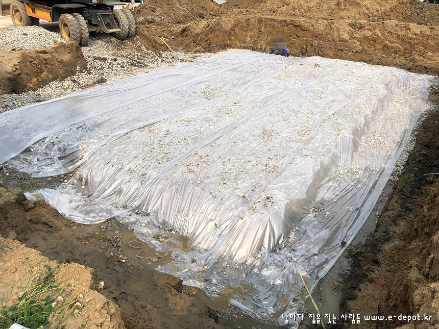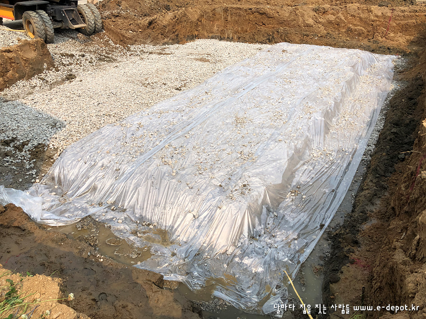 기초 바닥을 다 파내고 테두리 보를 동결심도 깊이에 맞춰 터파기 한 후 잡석을 포설하고 필름(비닐)을 깔아 놓은 사진입니다.