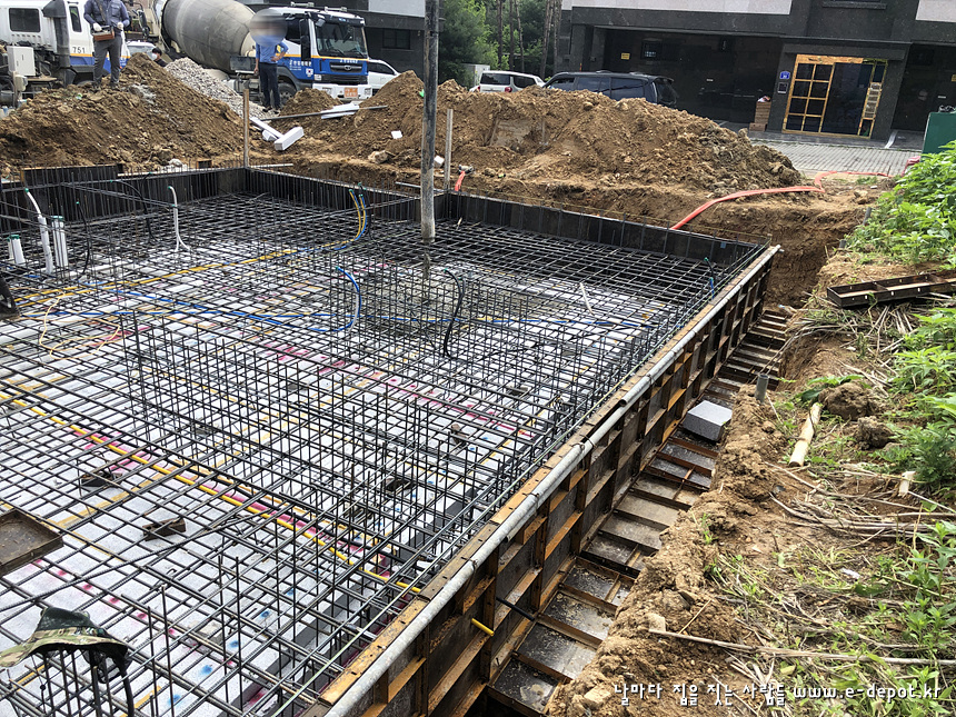 기초철근배근과 거푸집 작업이 마무리 되면 콘크리트 타설작업을 진행합니다.