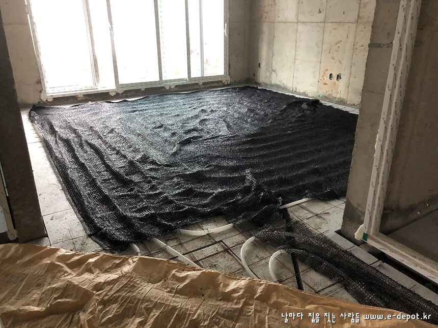 이때 그냥 몰탈을 타설하게 되면 난방코일이 들고 일어날 수 가 있어서 난방코일 위에 차광막등을 덮어줘야 안전합니다.