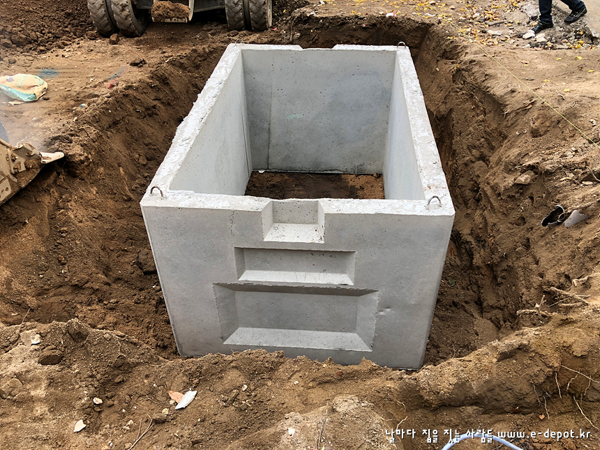 정화조 보호용 콘크리트 박스는 현장타설이나 기성품 콘크리트박스를 사용할 수 있는데 소규모 공사의 경우 기성품 콘크리트박스 매립이 공기단축은 물론 비용절감차원에서 유리합니다.
