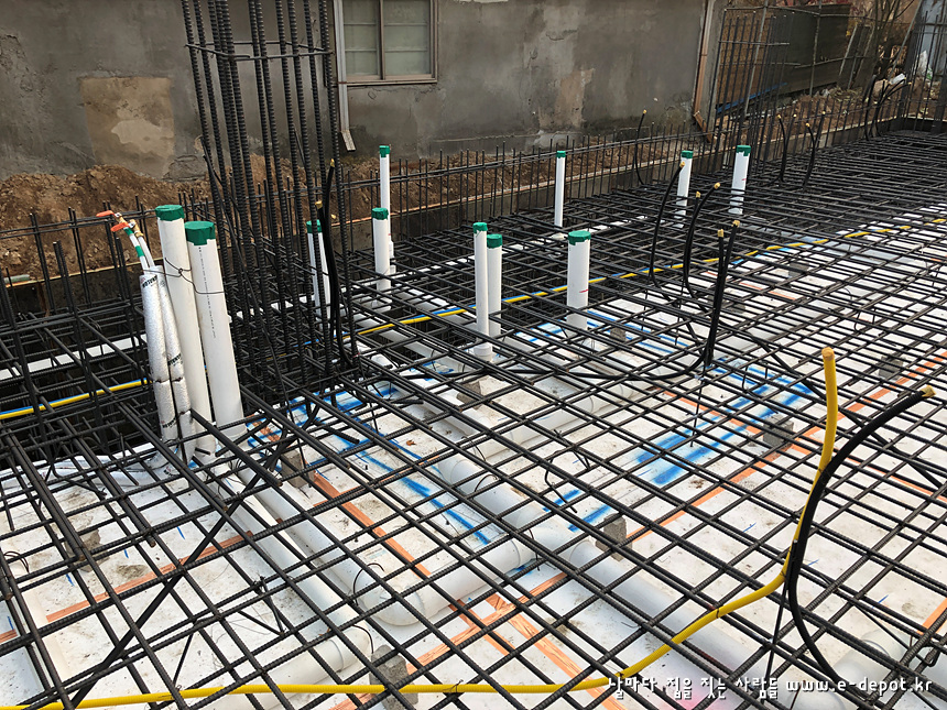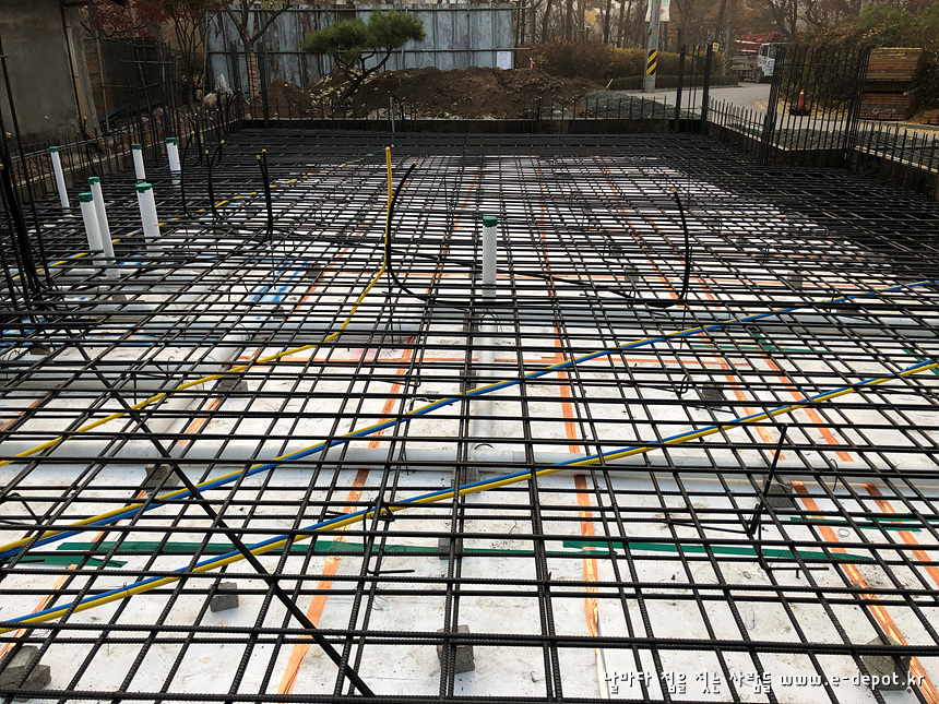 기초 철근배근과 거푸집 조성 및 전기배관이 마무리 된 사진입니다.