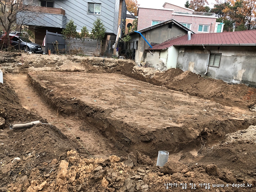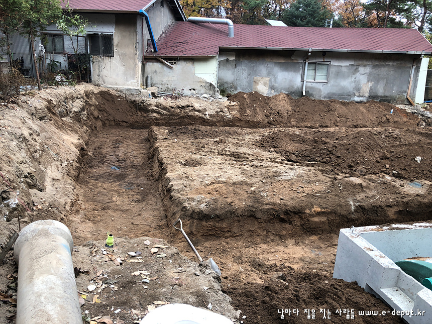정화조 매립을 한 후 기초 터파기를 시작합니다. 기초 터파기시 전체적으로 레벨에 맞춰 터파기 한 후 테두리보를 터파기 하는 순으로 진행하는게 좋습니다.