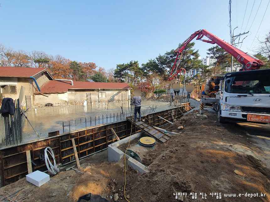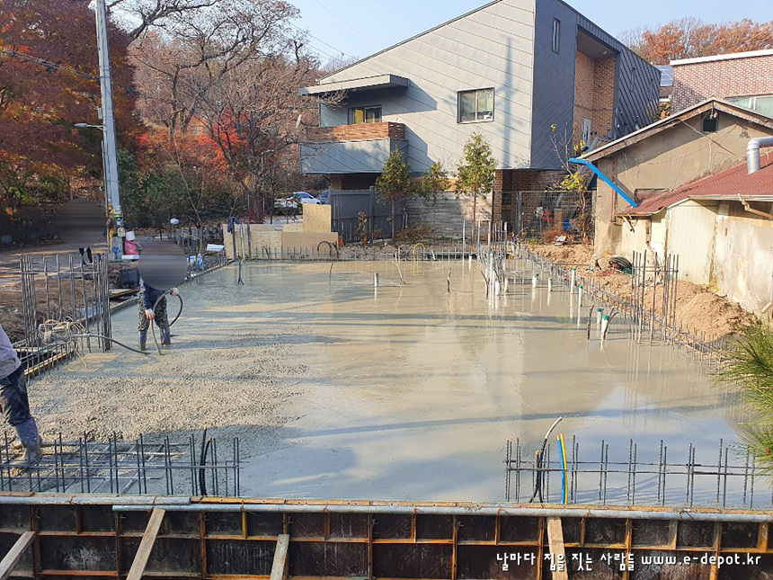 날마다집을짓는사람들의 방학동 근생주택신축사례. 기초터파기,정화조매립,버림콘크리트,기초철근배근,거푸집조성,콘크리트타설과정이었습니다.