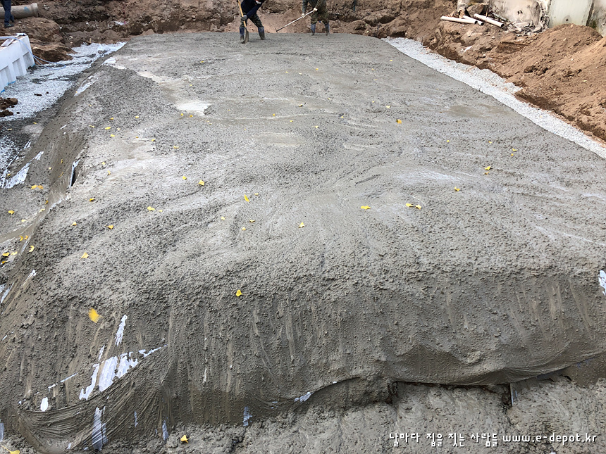버림 콘크리트 타설 중입니다. 버림콘크리트 타설 후 기후에 따라 1~2일 정도 양생 후 후속 공정을 진행하면 됩니다.