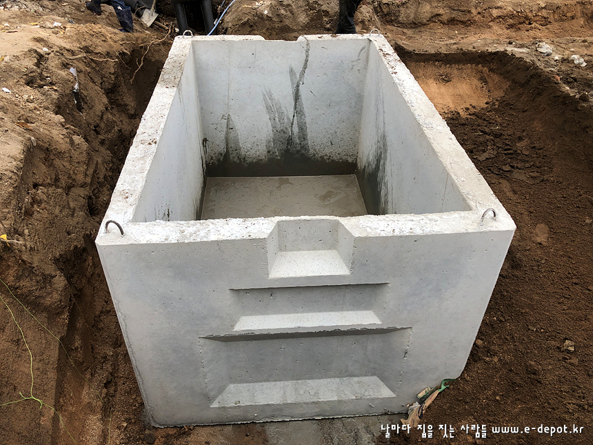 정화조 매립 방향이나 레벨에 맞춰 터파기 한 후 콘크리트 박스를 안착시킵니다.