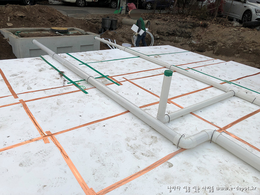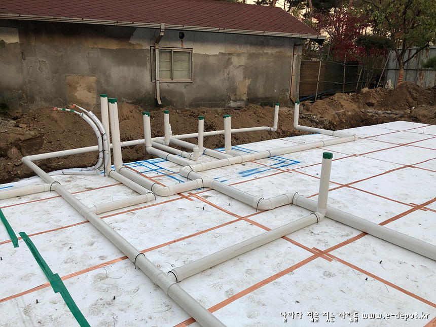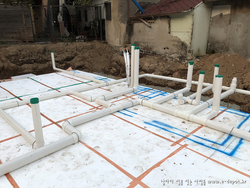 버림 콘크리트 타설 위 단열재를 깔고 위생배관을 시공한 사진입니다.
