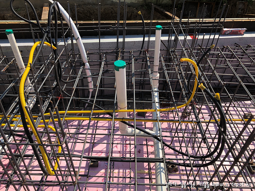 기초 전기배관사진입니다. 위생,급수 설비배관과 같이 철근배근작업과 병행하여 작업합니다.