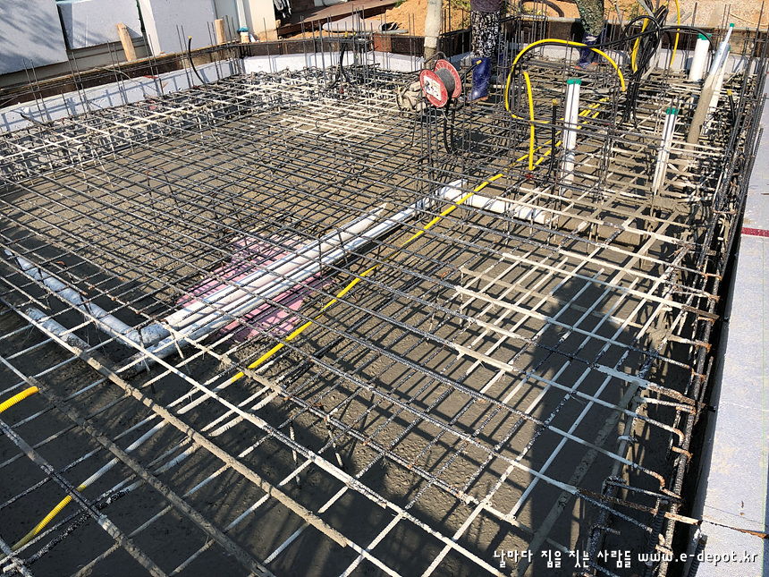 철근배근,전기,설비배관이 마무리 된 후 콘크리트를 타설하는 사진입니다.