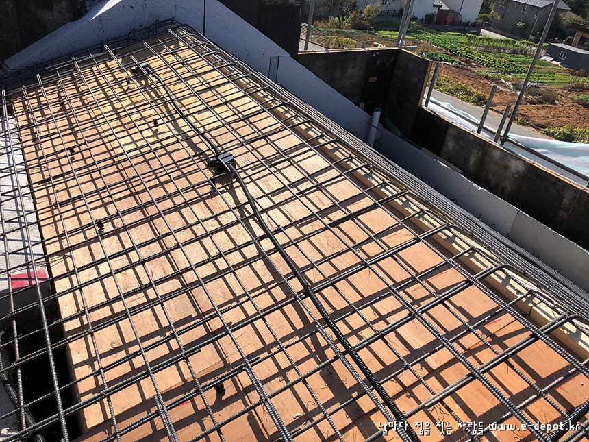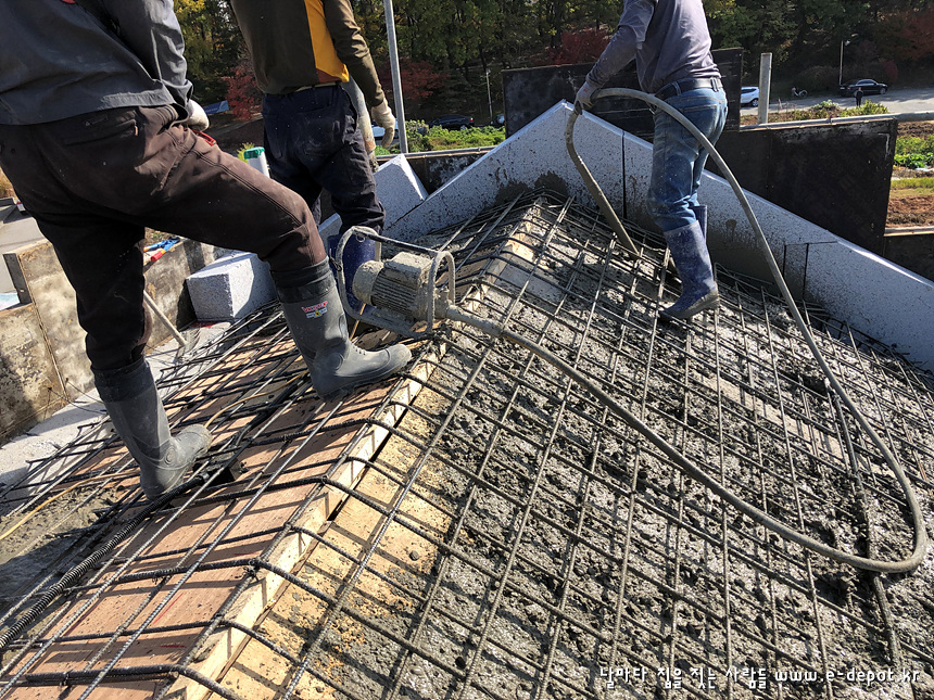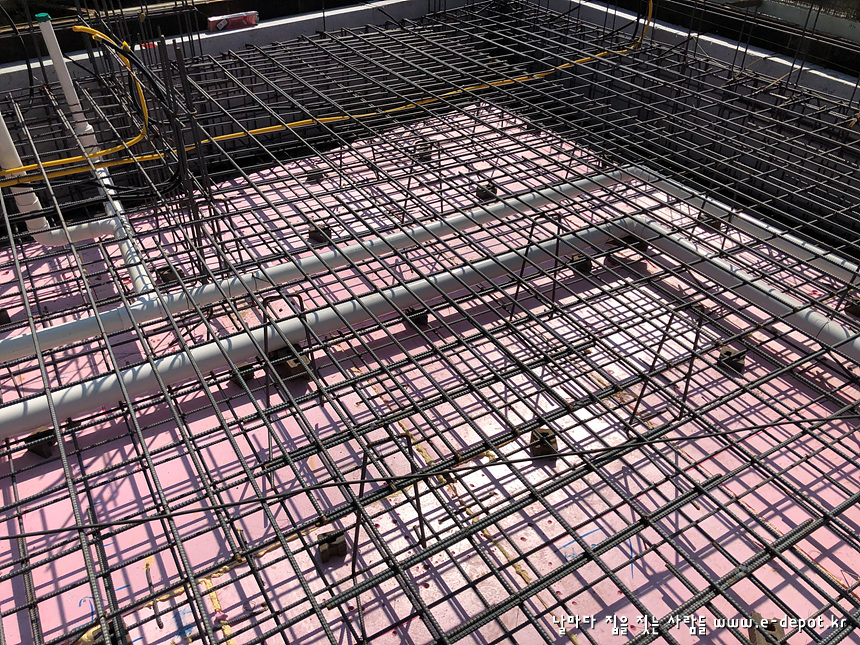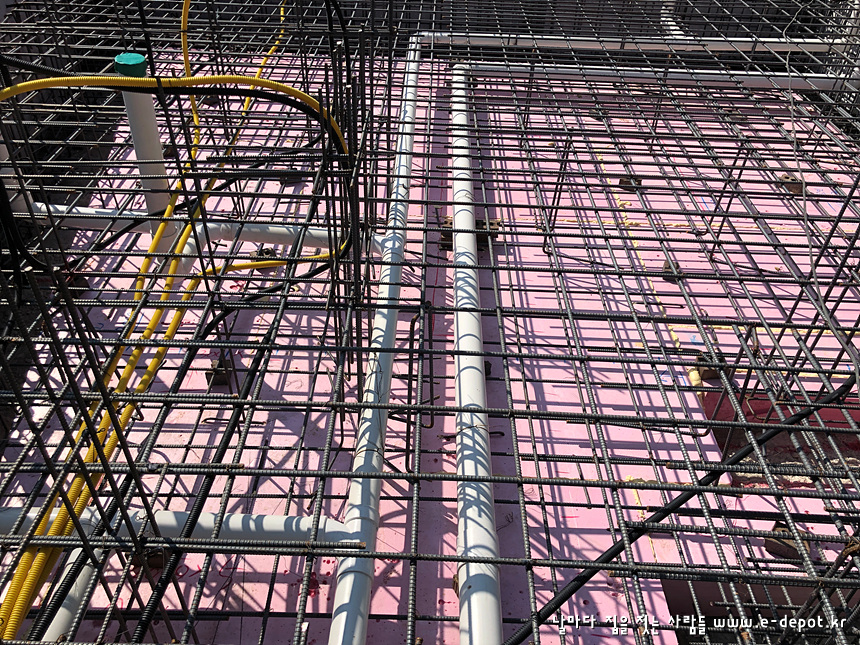 철근배근,전기,설비배관이 마무리 된 후 콘크리트를 타설하는 사진입니다.