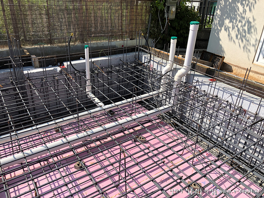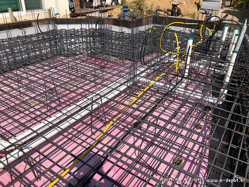 기초 철근배근 사진입니다. 위생,급수 설비배관을 병행합니다.